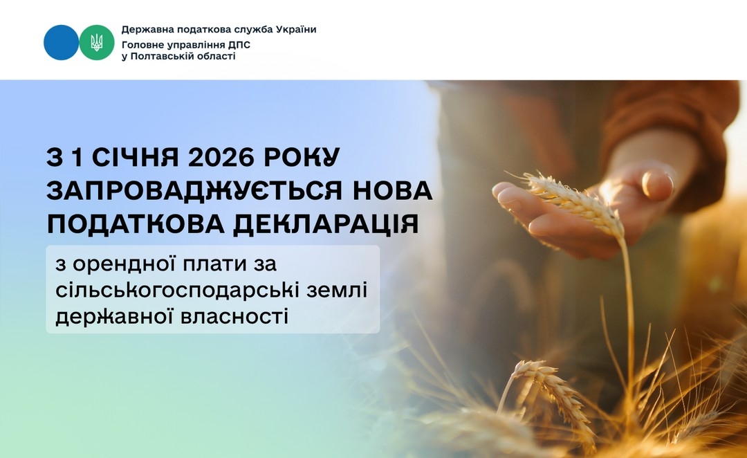 Головне управління ДПС у Полтавській області інформує, що з 1 січня 2026 року запроваджується нова форма податкової декларації з орендної плати для земельних ділянок сільськогосподарського призначення державної власності.