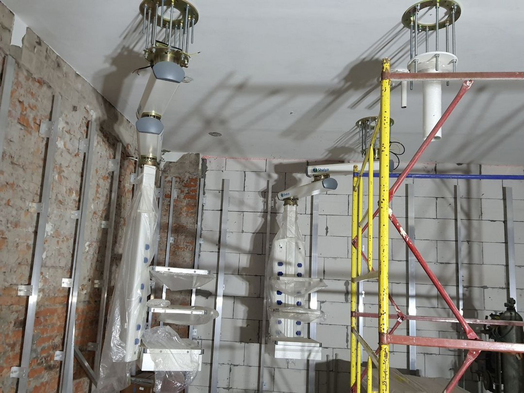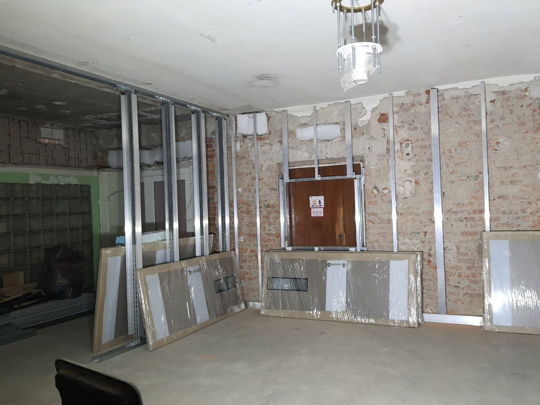 Наразі значний обсяг внутрішніх робіт зосереджено у головному лікувальному корпусі лікарні. На другому поверсі будівлі, у хірургічному відділенні, триває облаштування операційних залів №1 та №2. Будівельники проводять опорядження стін, стелі та підлоги, а також розпочали монтаж хірургічних консолей та операційних світильників. Для фінішного обшиття приміщень на об'єкт уже доставили двері та спеціальні HPL-панелі, які відповідають сучасним медичним стандартам зносостійкості та гігієни. Водночас технічне оновлення триває і у підвальному приміщенні корпусу, де спеціалісти працюють над влаштуванням індивідуального теплового пункту.