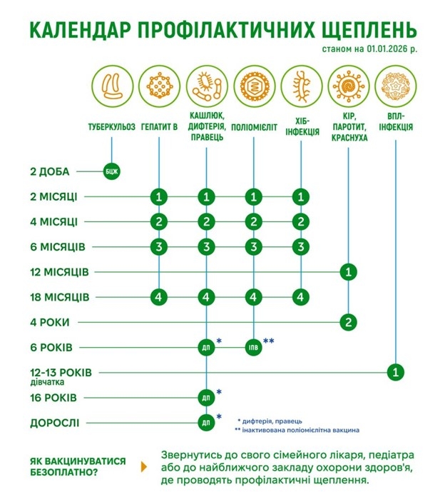 На зображенні — оновлений Календар профілактичних щеплень з 01.01.2026 року. Більше інформації — на сайті Міністерства охорони здоров’я.