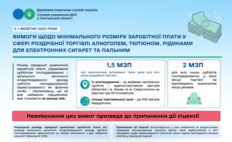 У Головному управлінні ДПС у Полтавській області повідомляють, що для суб’єктів господарювання, які вроздріб торгують алкогольними напоями, тютюновими виробами, рідинами для електронних сигарет та пальним, з 1 жовтня 2025 року запроваджуються вимоги щодо мінімального розміру середньої щомісячної заробітної плати або загального місячного оподатковуваного доходу.
