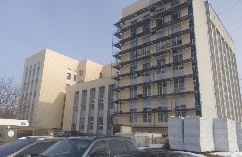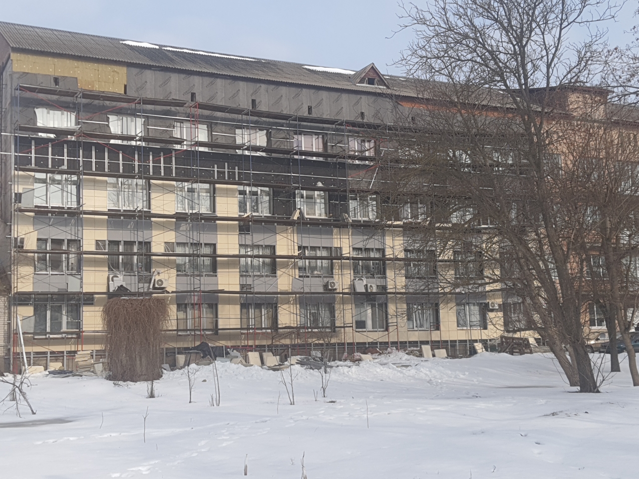 У рамках Надзвичайної кредитної програми для відновлення України (НКПВУ) будівельники здійснюють оздоблення фасаду поліклініки. Спеціалісти оновлюють зовнішні стіни із застосуванням металевих касет і сучасних теплоізоляційних матеріалів. Одночасно тривають внутрішні роботи у віконних зонах. У кабінетах, де вже встановлено нові енергоефективні віконні блоки, облаштовують відкоси та підвіконня. Це забезпечить належну герметизацію прорізів, підвищить теплозбереження.